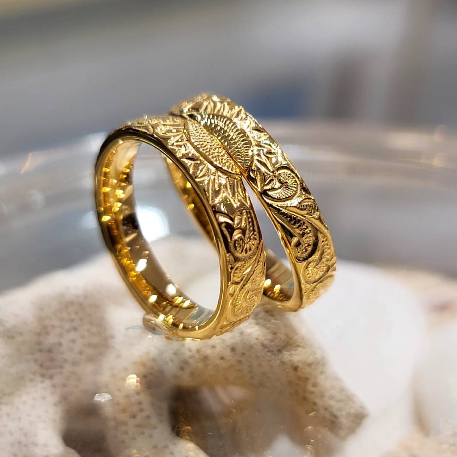 毎年シーズンで出るセレクトショップLIFEisとのコラボリングです。Sunflower(向日葵)とsun(太陽)の重なり合う表情がとても良きリング。スクロール(波)の彫りはディープカット(深彫り)にしているので高級感でラグジュアリーに仕上げています。