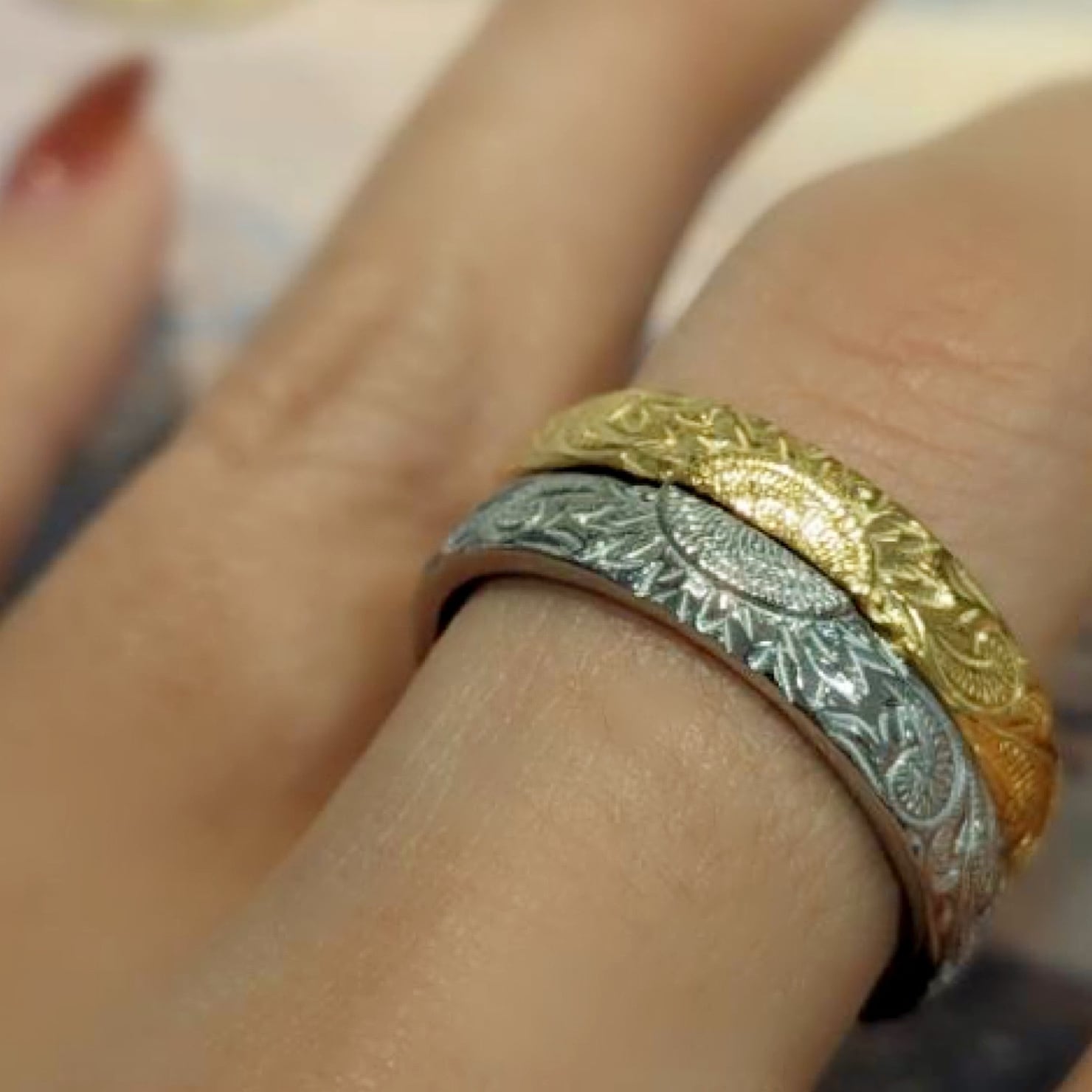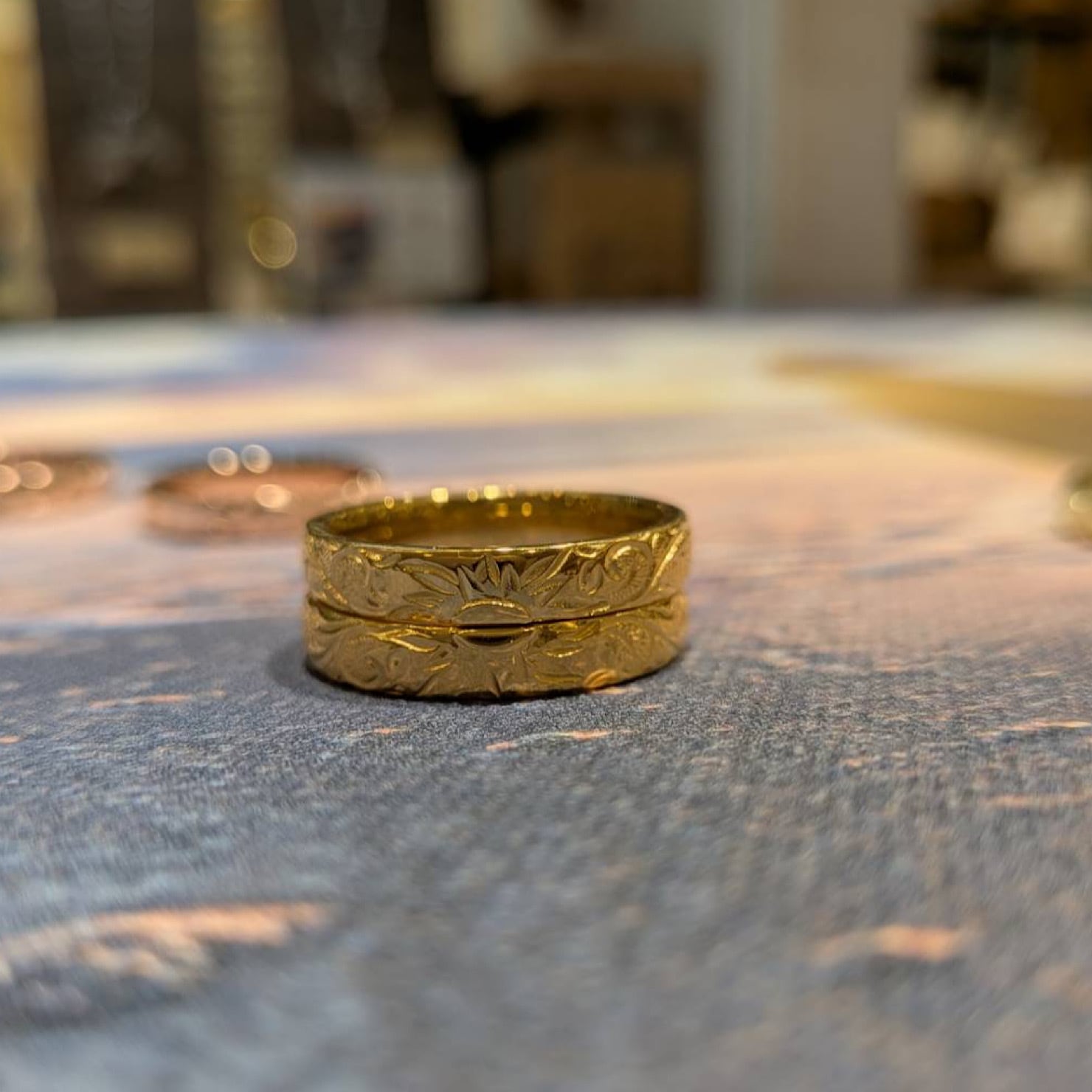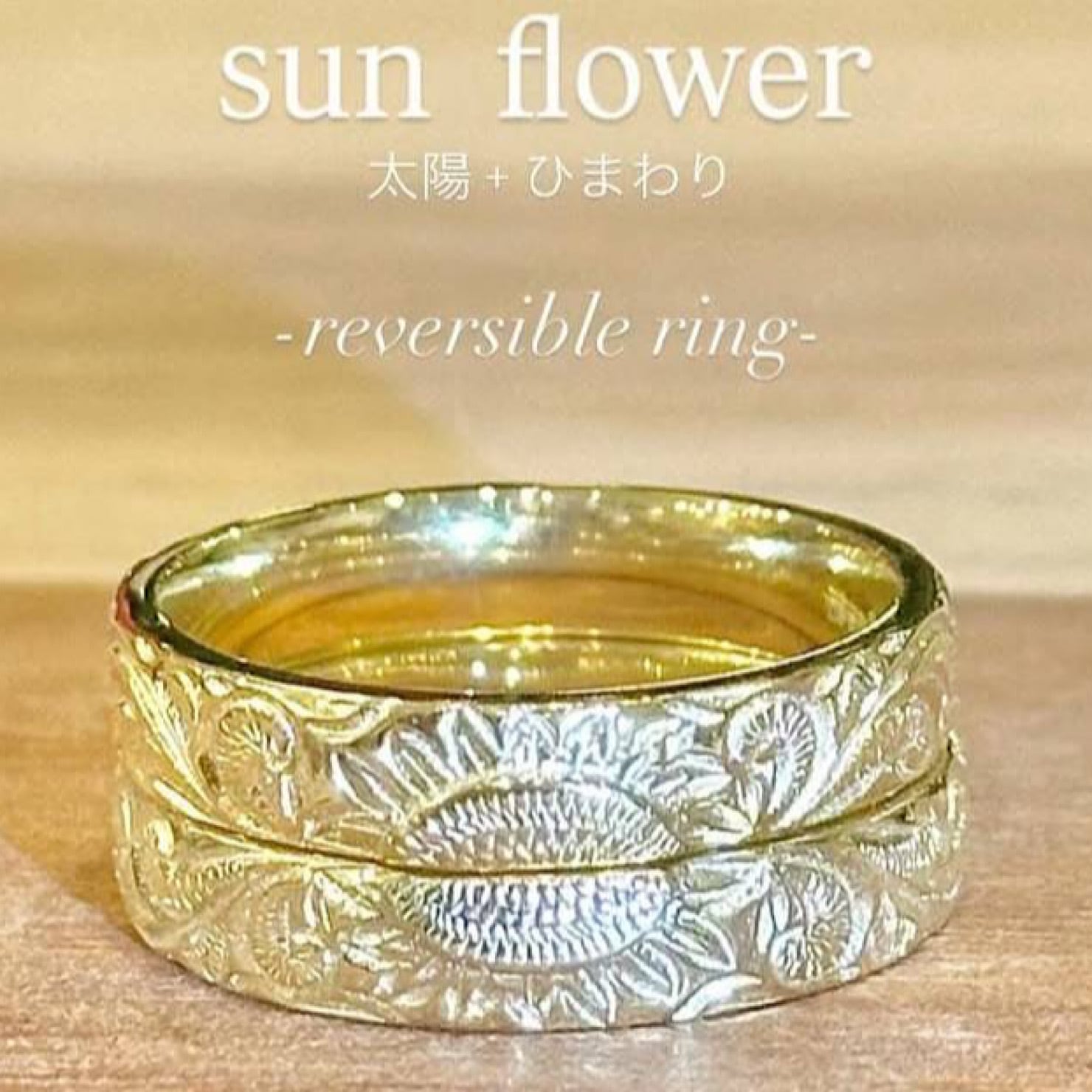 毎年シーズンで出るセレクトショップLIFEisとのコラボリングです。Sunflower(向日葵)とsun(太陽)の重なり合う表情がとても良きリング。スクロール(波)の彫りはディープカット(深彫り)にしているので高級感でラグジュアリーに仕上げています。
