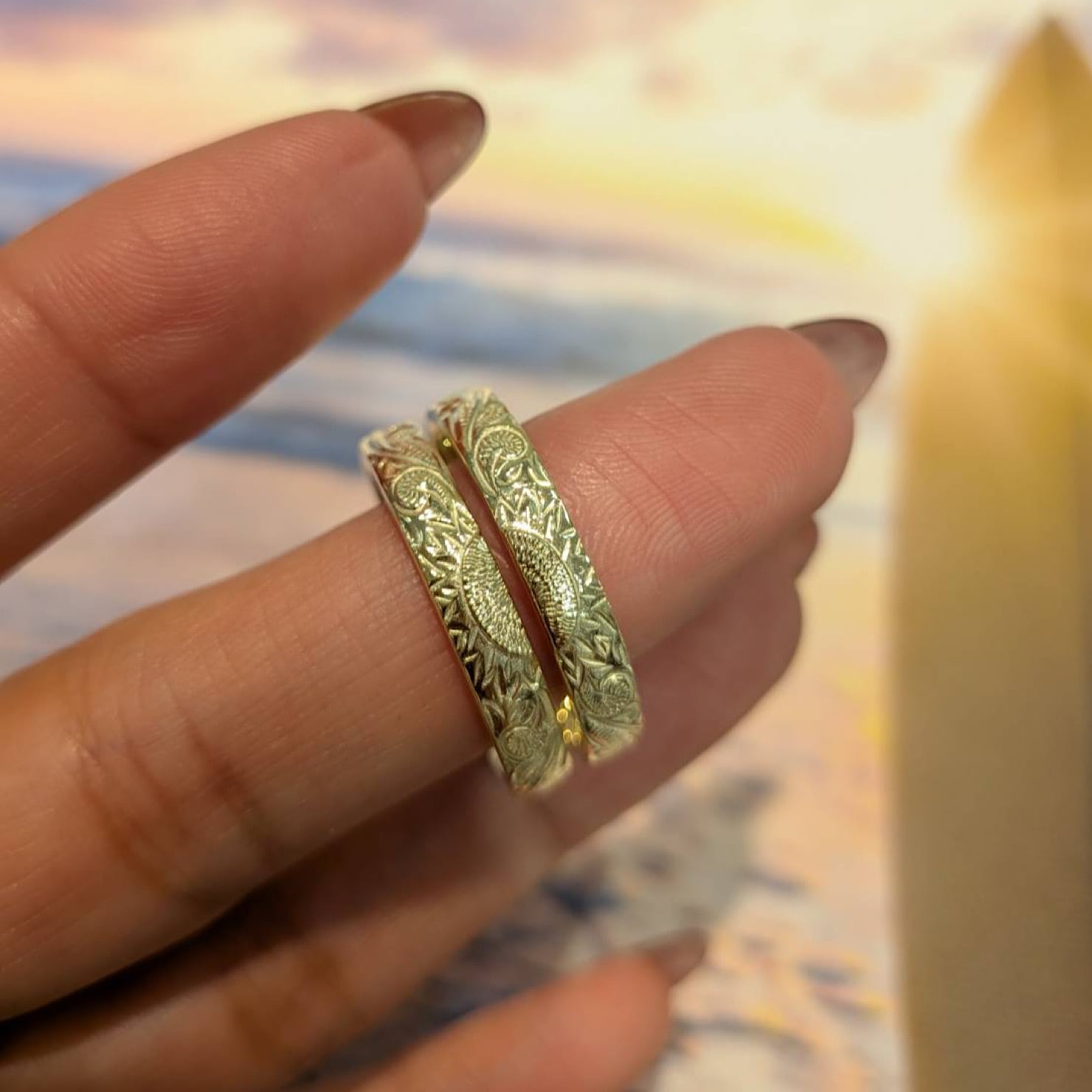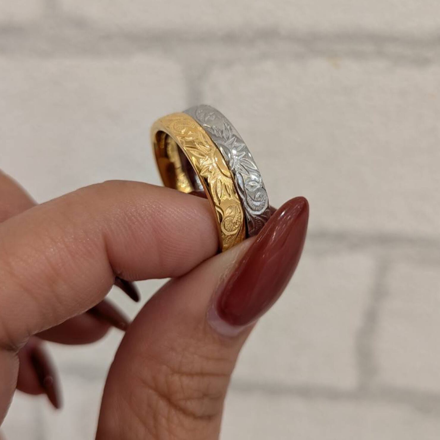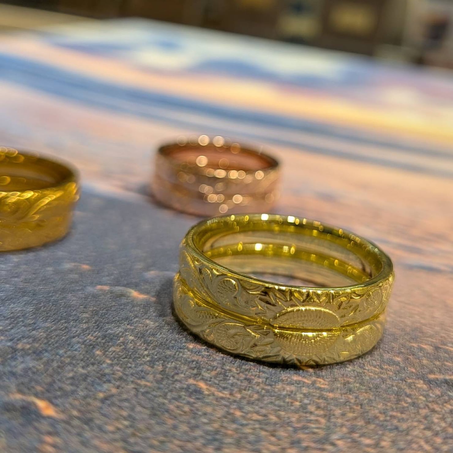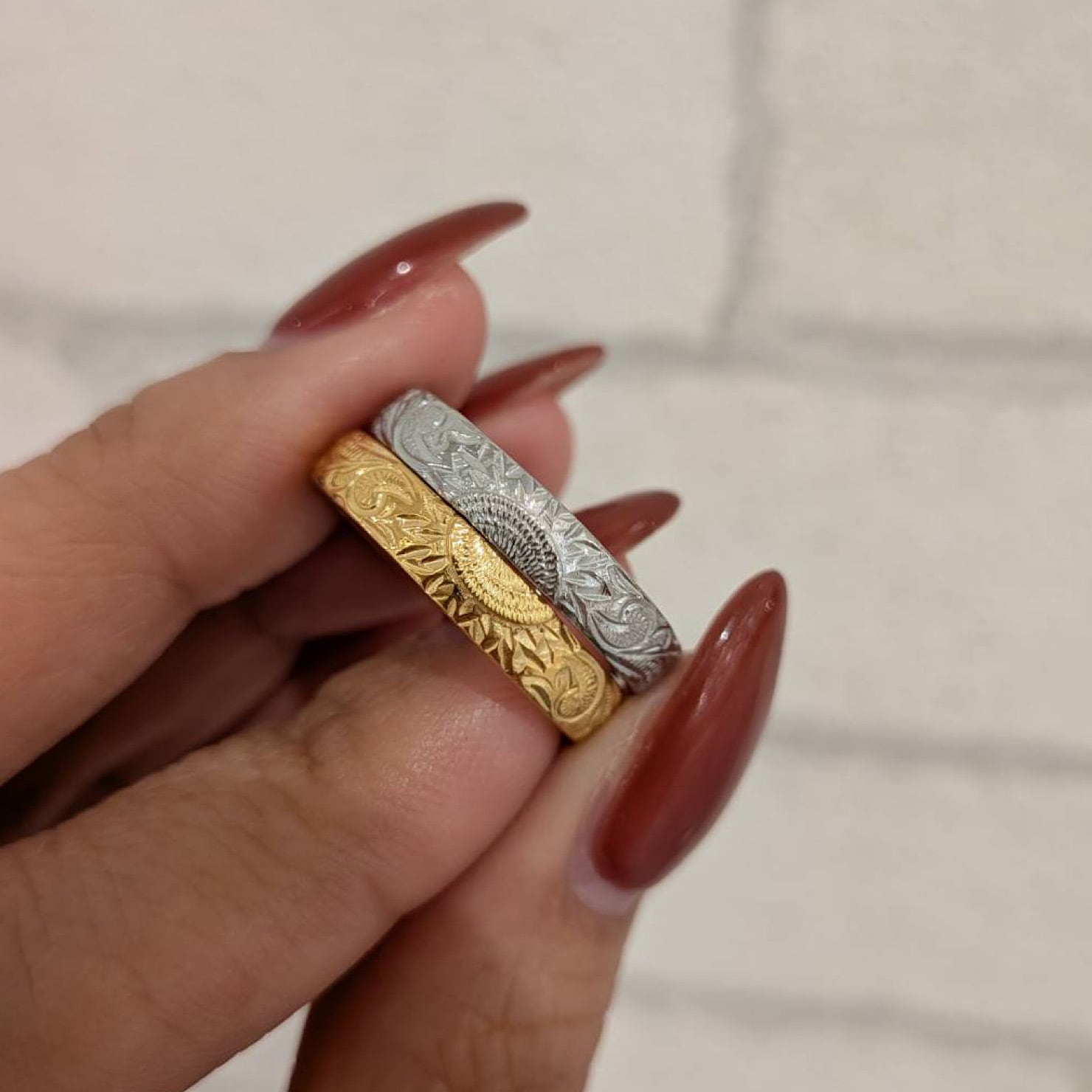 毎年シーズンで出るセレクトショップLIFEisとのコラボリングです。Sunflower(向日葵)とsun(太陽)の重なり合う表情がとても良きリング。スクロール(波)の彫りはディープカット(深彫り)にしているので高級感でラグジュアリーに仕上げています。