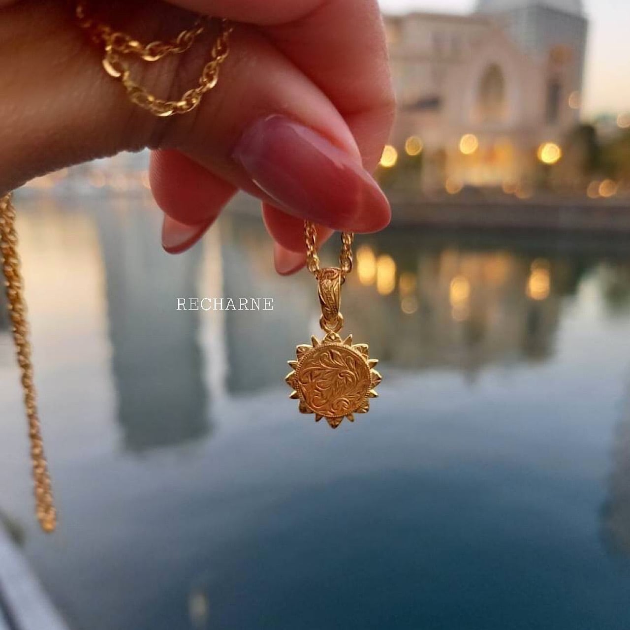 『RECHARNE』オリジナルのSun God necklace。トップそのものが太陽の形になっています。また、表面と裏面が同じデザインになっているアイテムです。ハワイアンの彫りが繊細に彫られています。コインタイプなので服装を選ばずに着けられます。
